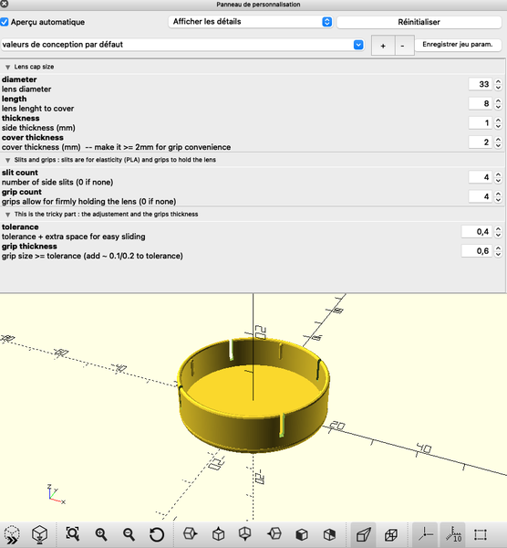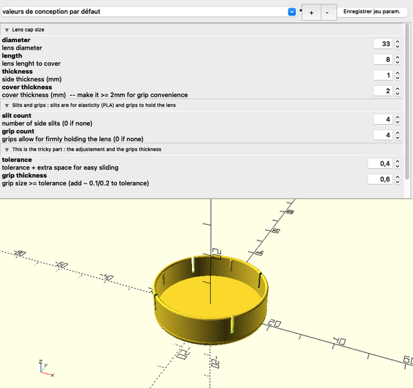 I made some lens caps for my old cameras. A foca (french camera from the 50s) and my grapflex. They have some slits for elasticity and some grips inside. I made them with PLA, but I should try PETG for more elasticity. I usec openScad for parametric design.