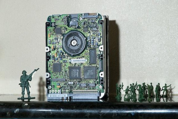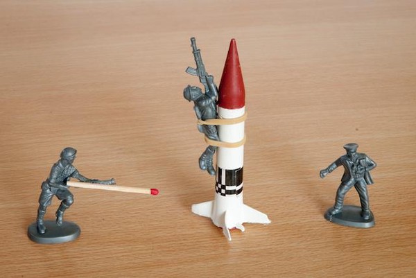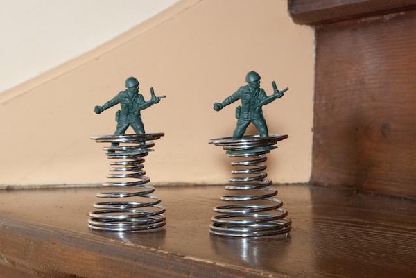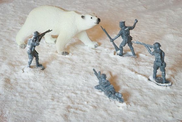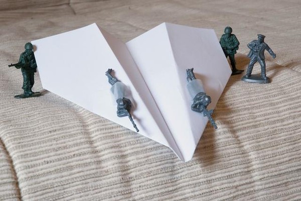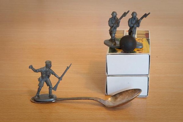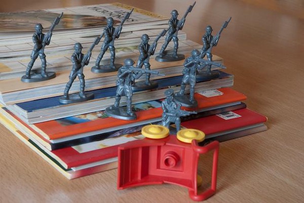Est-il vraiment sérieux de jouer aux petits soldats ? Sans doute non. Mais le photographe a beau jeu de prétexter la recherche plastique pour retrouver le temps d’une prise de vue les joies du petit garçon, qui alignait ses soldats pour inventer des histoires abracadabrantesques. Il rejoue les « canons de Navarone», se prend pour Gregory Peck et invente des gadgets à la James Bond. La prise de vues terminée, le photographe doit redonner les jouets à son fils. Celui-ci regarde les photos de son père d’un œil suspicieux.